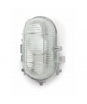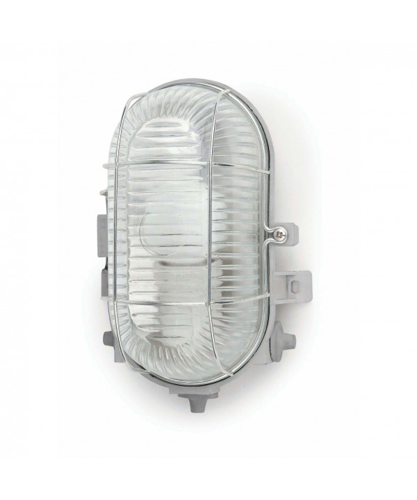 Aplique clásico para terraza y jardín fabricado en PVC, difusor de cristal translúcido y rejilla de metal.