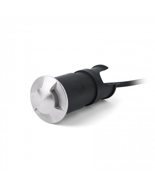Empotrable de exterior de estilo moderno fabricado en acero inoxidable 316 y difusor de cristal transparente. La fuente de luz es LED 3W 3000K incluida. Driver no incluido. Proyecta un bonito haz de luz.