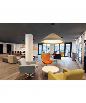HUE IN es un colgante diseñado por Nahtrang disponible en diferentes colores. Esta luminaria tiene una original pantalla elaborada con cintas, creando una ilusión óptica de pantalla compacta. HUE IN es perfecta para la iluminación del hogar y los halls de los hoteles.
