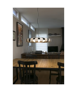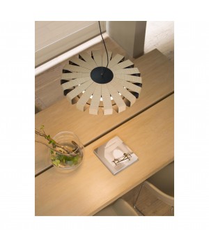 PAULINE es un colgante de diseño creado por Nahtrang, fabricado en madera y metal con difusor de policarbonato. Con su tecnología LED de 24W dimable y luz cálida, integrada en la luminaria, proporciona confort en la iluminación de espacios interiores. PAULINE es una lámpara de gran presencia en la que la luz se escapa por las rendijas de madera y crea una mágica atmósfera.