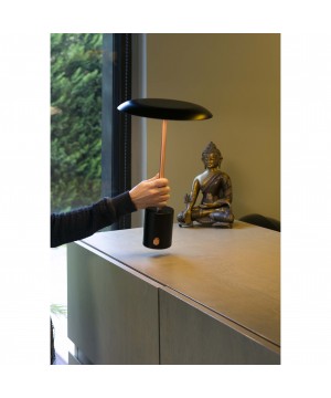 Llega la versión portatil de HOSHI en negro y cobre, una lámpara de sobremesa de diseño de xJeR Studio. Su sólida base le da estabilidad a la luminaria que se caracteriza por un estilizado cuerpo y pantalla. Se puede regular la intensidad de la luz