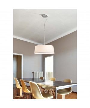 Colgante moderno fabricado en metal y pantalla textil. Diseñada por: Alex & Manel Lluscà.