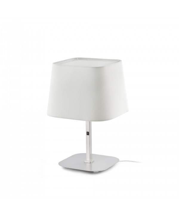 Lámpara de sobremesa de color blanco y con acabados en níquel mate.