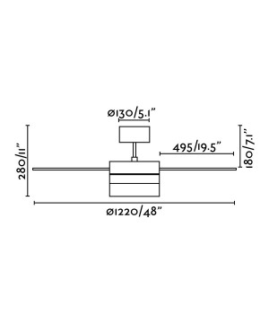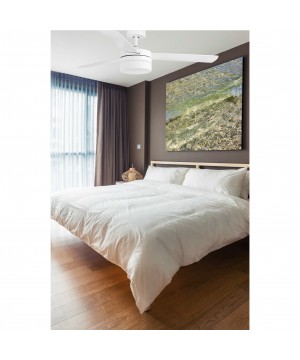 Ventilador de techo blanco de líneas modernas ideal para la ventilación de espacios desde 13m2 hasta 17m2. Motor fabricado en acero, palas de ABS acabadas en blanco/arce reversibles y difusor de cristal opal. Accionado por mando a distancia, incluido. PANAY dispone de 3 velocidades regulables con un consumo de 14-30-58W y 95-150-200 revoluciones por minuto según velocidad.