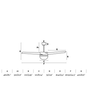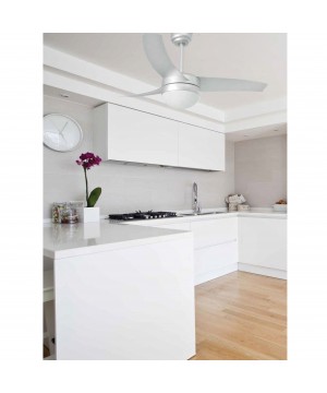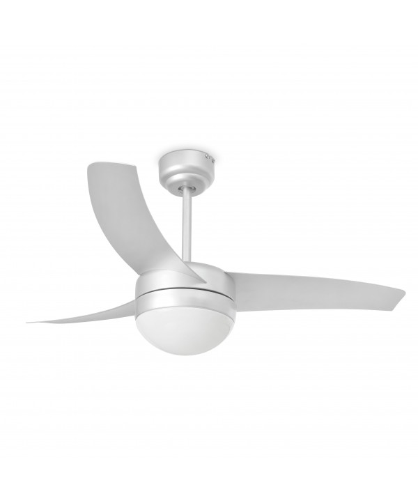 Ventilador de techo moderno con luz ideal para habitaciones de hasta 13m2. Motor fabricado en acero , palas en ABS y difusor de cristal opal. El acabado de las palas es blanco y son no reversibles. Accionado por mando a distancia, incluido. Dispone de 3 velocidades regulables con un consumo de 10,7-23,5-68,1w y 105-185-285 revoluciones por minuto según velocidad.Este ventilador dispone de función inversa. Este ventilador es apto para techo inclinado