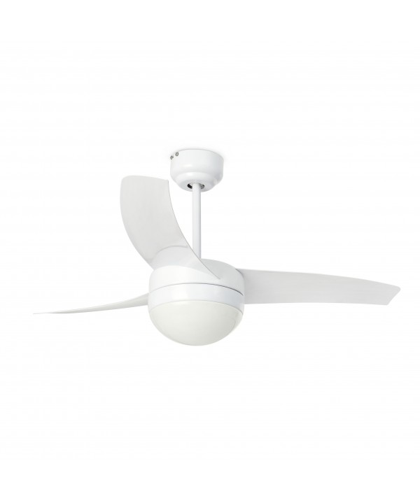 tas ideal para habitaciones de hasta 13m2. Motor fabricado en acero, palas de ABS y difusor de cristal opal. El acabado de las palas es blanco y son no reversibles. Accionado por mando a distancia, incluido. Dispone de 3 velocidades regulables con un consumo de 10,7-23,5-68,1w y 105-185-285 revoluciones por minuto según velocidad. Este ventilador dispone de función inversa y sistema de fácil instalación. Este ventilador es apto para techo inclinado.