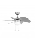 Ventilador de techo con luz de líneas modernas ideal para habitaciones de hasta 13m2. Motor fabricado en acero, palas de madera MDF y difusor de cristal opal. El acabado de las palas es gris cava y son no reversibles. Accionado por cadena. Dispone de 3 velocidades regulables con un consumo de 24-33-46W y 135-190-242 revoluciones por minuto según velocidad. Este ventilador dispone de función inversa.
