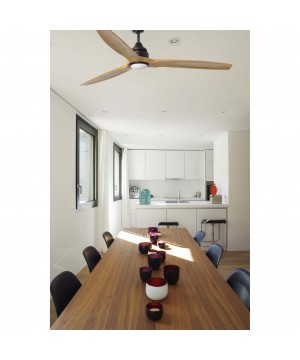 Ventilador de techo con luz de líneas modernas ideal para estancias más grandes de 17,6m2. Fabricado en acero, palas de madera y difusor de cristal opal. Accionado por mando a distancia (incluido). Este ventilador tiene función inversa y es apto para techos inclinados. Dispone de 3 velocidades regulables con un consumo de 14-30-56W y 80-113-155 revoluciones por minuto según velocidad.