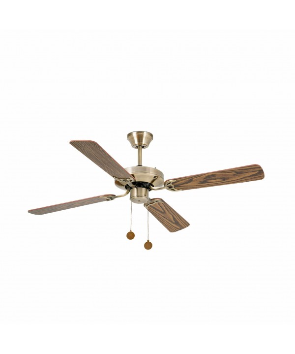 Ventilador de techo oro viejo de estilo atemporal con 4 palas reversibles. Sus materiales y acabados le confieren un aspecto atractivo y elegante. YAKARTA es ideal para habitaciones de 13m2 hasta 17,6m2. Accionado por cadenas. Este ventilador dispone de 3 velocidades regulables.ÊEste ventilador dispone de funci—n inversa, pudiŽndose usar en los meses m‡s fr’os del invierno. Perfecto para ambientes coloniales. Caudal de aire: 94,57 m3 min / 3340 CFM. Apto para techo inclinado y para ser instalado directo a techo.